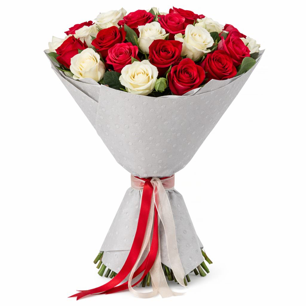 Элегантное сочетание белых и красных роз создаёт атмосферу нежности и страсти. Букет состоит из одноголовых роз, оформленных в белую крафт-бумагу с фактурой и украшенных атласной лентой. Композиция привнесёт изысканность в любое пространство. Подойдёт для поздравления мамы на День матери.