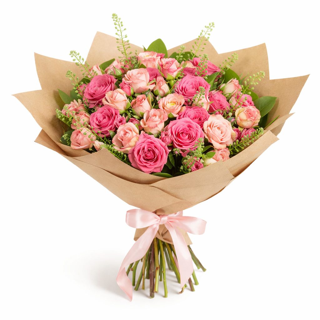 Нежные оттенки розового создают атмосферу романтики и свежести. Букет состоит из кустовых роз в миксе розовых оттенков и зелени. Упакован в крафт-бумагу с матовой плёнкой, украшен розовой лентой. Эта композиция привнесёт атмосферу весеннего обновления в дом. Подходит для подарка на свидание для любимой.