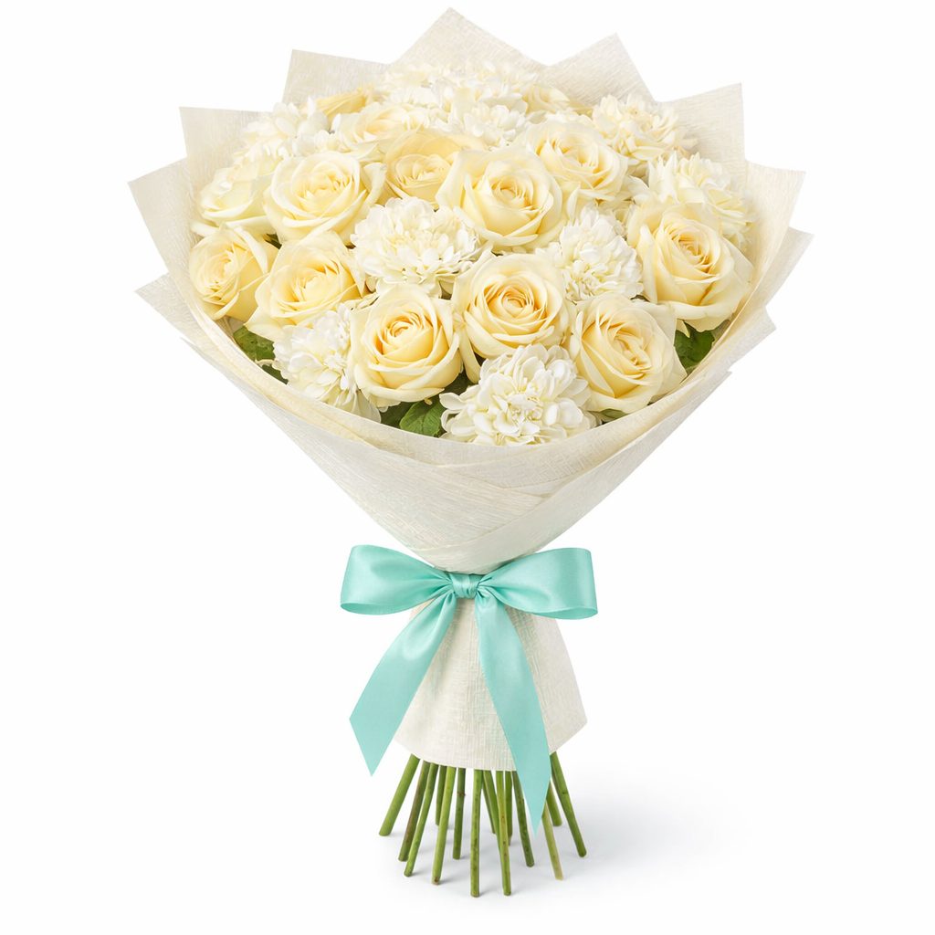 Этот букет в белоснежной цветовой гамме придаёт ощущение чистоты и утончённости. В составе белые розы и гвоздики, которые гармонично дополняют друг друга. Упакован в матовую плёнку и украшен цветной лентой, которая добавляет изысканности. Создаёт романтическую атмосферу. Идеально подойдёт для поздравления коллеги с повышением.