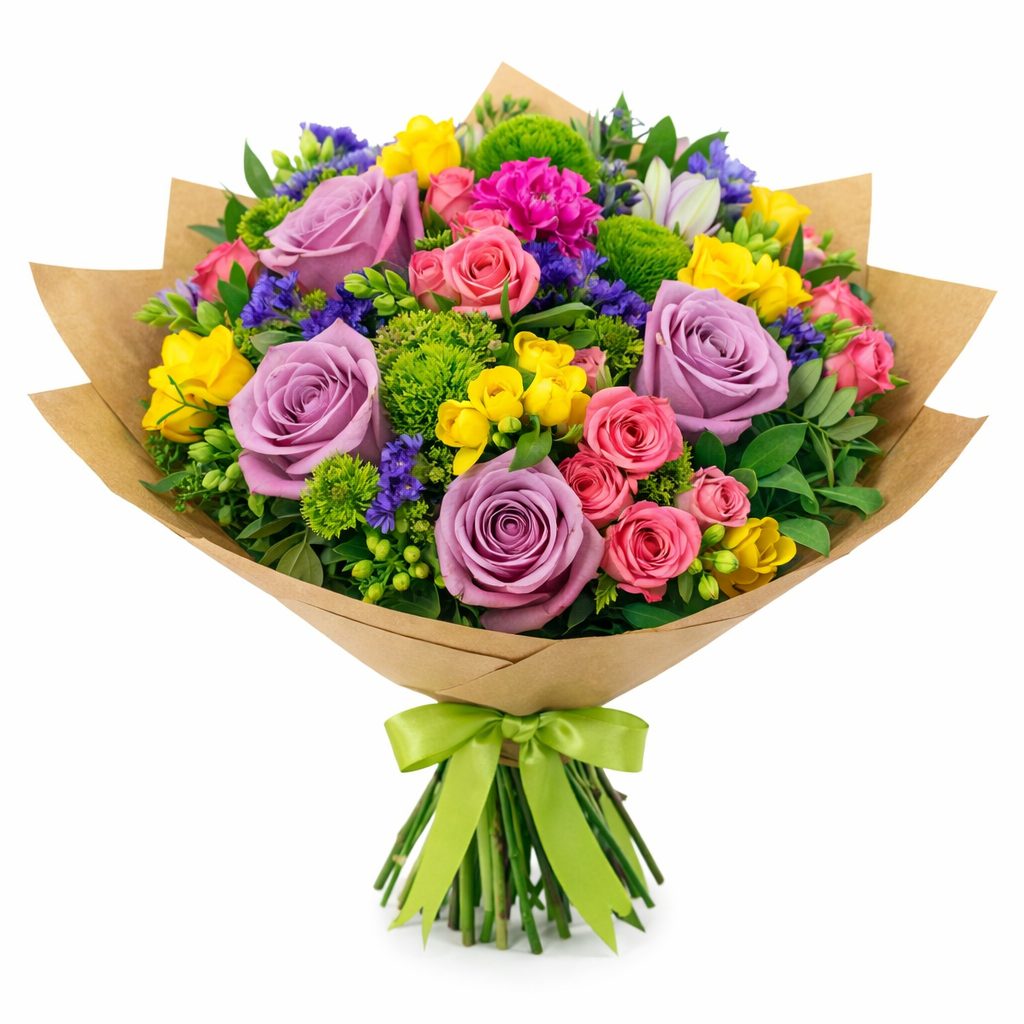 Этот букет наполнен яркими эмоциями и насыщенными красками. Сиреневая роза, розовая кустовая роза, желтая фрезия, розовая гвоздика, розовая альстромерия, статица и зелень создают гармоничное сочетание. Упакован в крафт-бумагу с рисунком и украшен яркой лентой. Эта композиция создает атмосферу праздника и идеально подойдет на День знаний для учительницы.