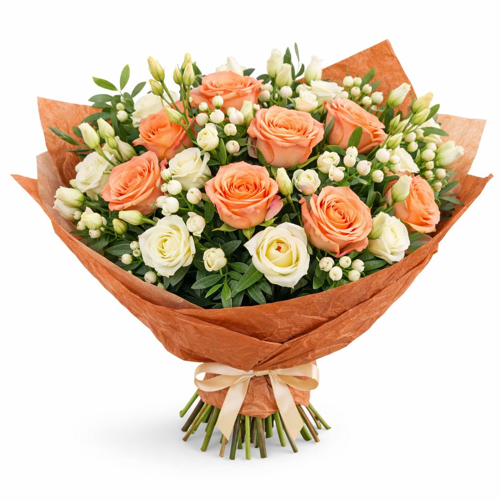 Тёплый и нежный букет, сочетающий пыльно-розовые розы, белые эустомы и гиперикум, создаёт атмосферу утренней свежести. Дополняется фисташкой, придающей композиции воздушность. Упакован в крафт-бумагу тёплого оттенка с декоративной лентой, завязанной аккуратным бантом. Этот букет станет прекрасным подарком для любимой жены на годовщину.
