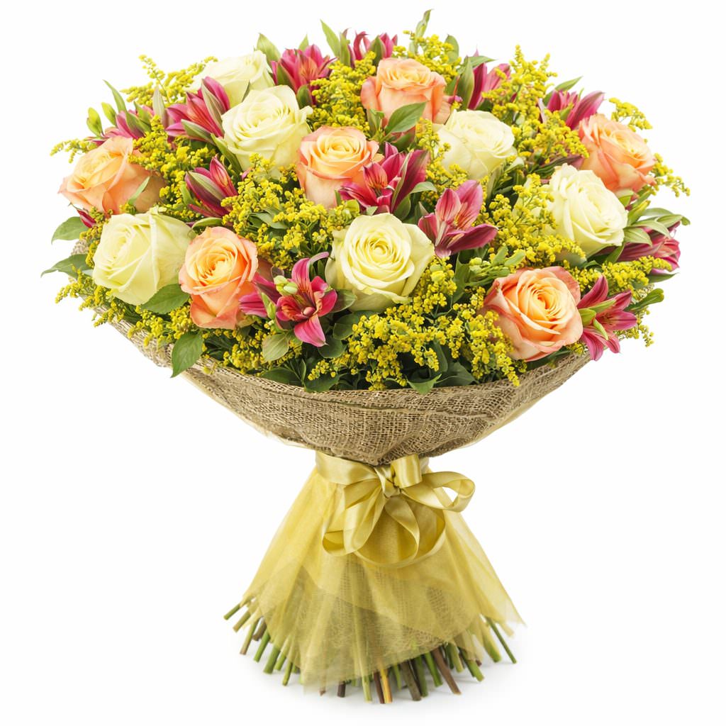 Энергия и яркость желтых роз, нежность розовых альстромерий и солнечного солидаго создают ощущение радости и тепла. Букет включает в себя розы одноголовые желтые, альстромерии розовые и солидаго. Композиция оформлена в крафт-бумагу с декоративной сеткой и дополнена атласной лентой. Этот букет идеально подойдет для празднования юбилея и станет замечательным подарком для коллеги.