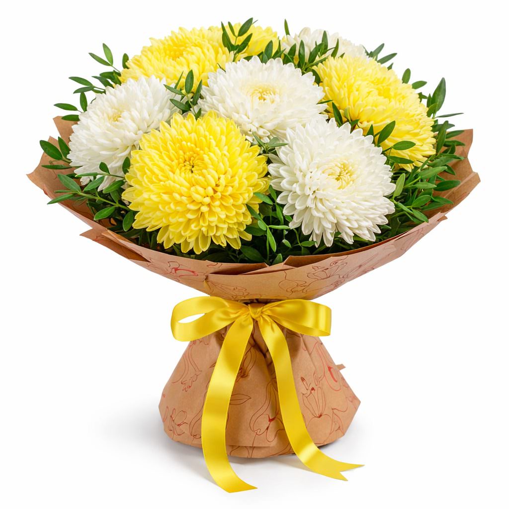 Этот букет сочетает в себе белоснежные и солнечно-жёлтые хризантемы, окружённые свежей зеленью. Каждая хризантема выделяется своим цветом и формой, создавая яркий контраст. Упакован в крафт-бумагу с рисунком, украшен жёлтой атласной лентой. Композиция создаёт ощущение радости и тепла. Прекрасный выбор для поздравления директора на День влюблённых.