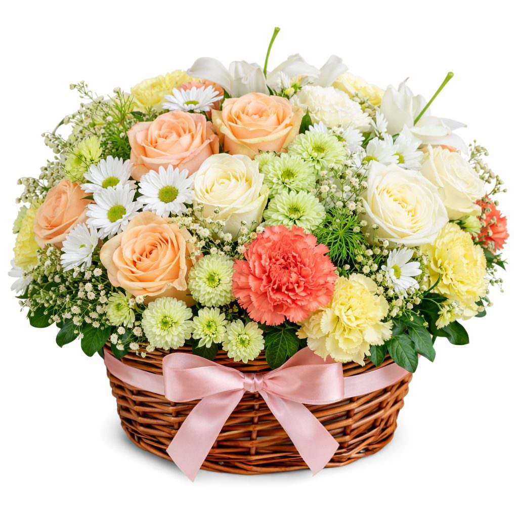 Яркая композиция, наполненная теплом и светом, сочетает в себе персиковые и белые розы, белые и желтые кустовые хризантемы, а также розовые и желтые гвоздики с зеленью. Все цветы аккуратно расположены в плетёной корзине, добавляющей природной эстетики. Этот букет создаст атмосферу уюта и радости, идеален для поздравления преподавателя на День учителя.
