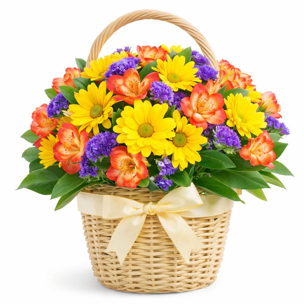 Эта яркая композиция удивляет гармонией жёлтых хризантем, оранжевых кустовых гвоздик и фиолетового лимониума. Все цветы собраны в плетёную корзину, которая подчёркивает их естественную красоту. Композиция создаёт атмосферу радости и уюта. Идеально подходит для подарка сестре на День знаний.