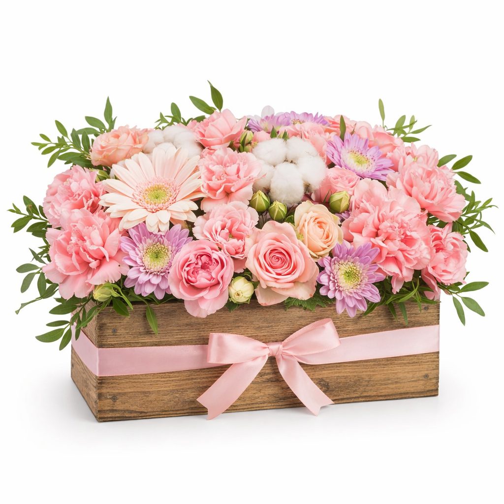 Нежная цветовая гамма сиреневых и розовых оттенков создаёт атмосферу уюта и романтики. Композиция включает сиреневые и розовые герберы, розовые гвоздики, розовые кустовые розы и хлопок, дополненные фисташкой. Цветы аккуратно уложены в деревянный ящик, который подчёркивает их природную красоту. Идеально подойдёт для подарка на встречу выпускников для любимой женщины.