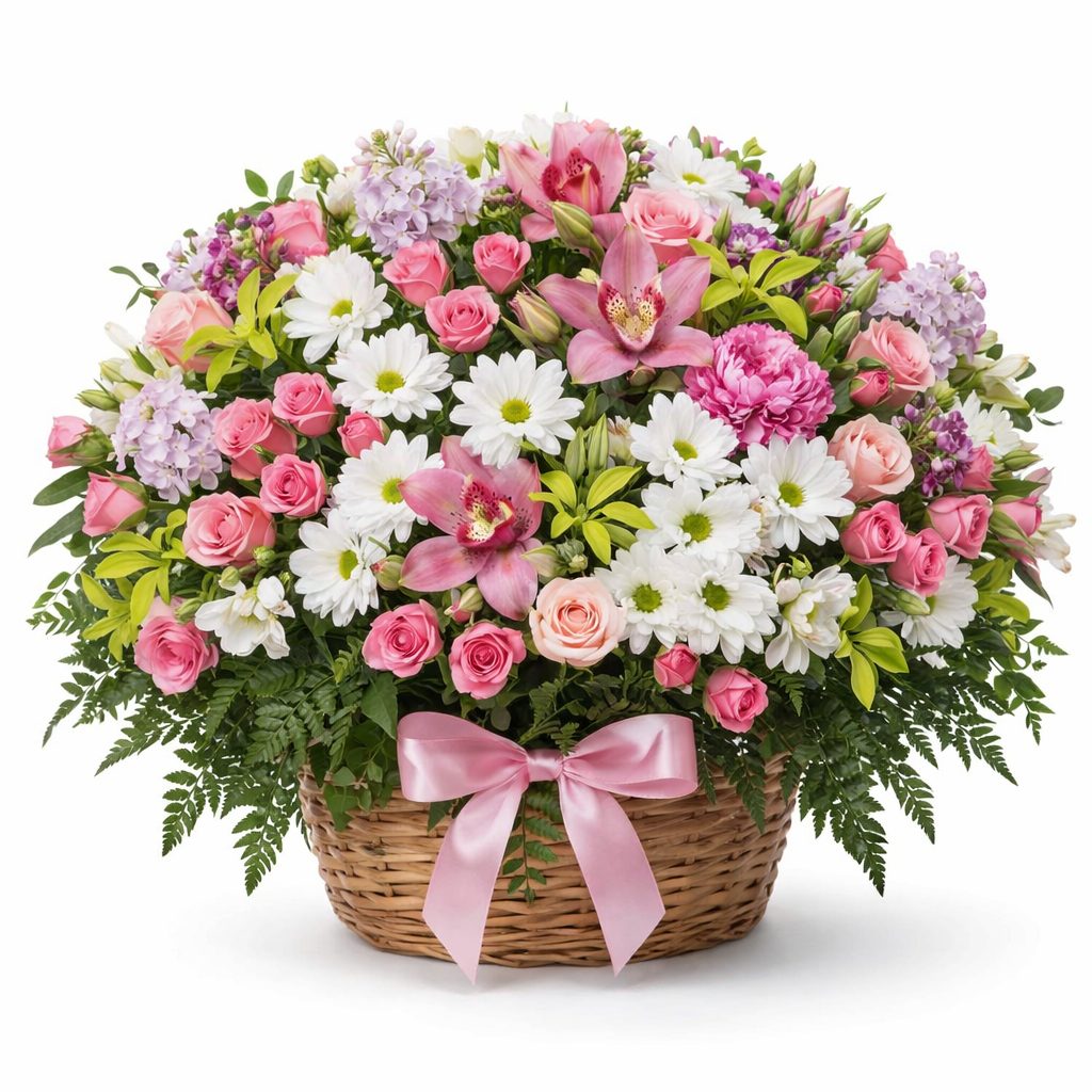 Эта композиция дарит нежность и гармонию, сочетая розовые и белые оттенки. В букете присутствуют розовые и белые кустовые розы, розовые орхидеи, белые альстромерии, розовые пионы, белые кустовые хризантемы и солидаго. Цветы аккуратно размещены в плетёной корзине. Композиция создаёт атмосферу романтики, идеально подходящую для свидания. Порадует любимую женщину на 8 Марта.