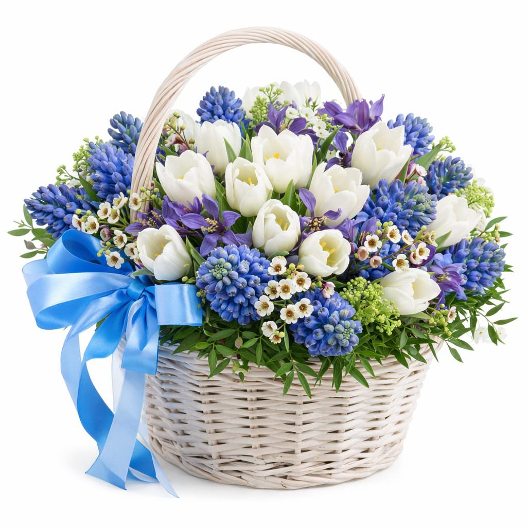 Эта композиция дарит ощущение свежести и утонченности благодаря белым тюльпанам и синим гиацинтам, дополненным нежными ромашками и васильками. Цветы уложены в плетёную корзину светлого оттенка, украшенную голубой ленточкой. Композиция создаёт атмосферу весеннего праздника и станет прекрасным подарком на День семьи, любви и верности для любимой женщины.