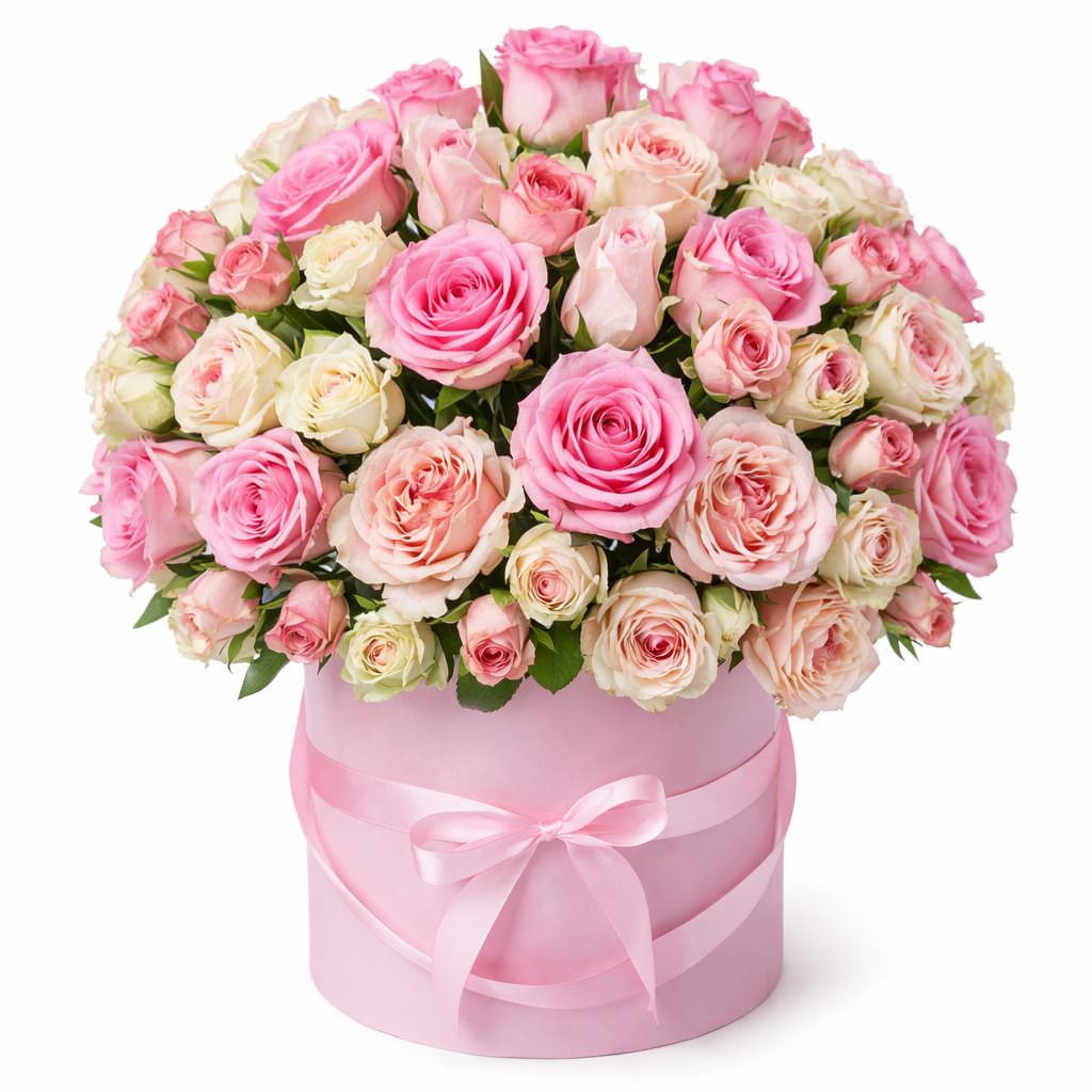 Эмоциональный розовый и кремовый букет из роз одноголовых, кустовых и пионовидных создаёт атмосферу нежности и изысканности. Композиция оформлена в шляпной коробке нежного розового цвета с атласной лентой. Букет привнесет романтическую атмосферу и станет идеальным подарком на День Святого Валентина для любимой женщины.