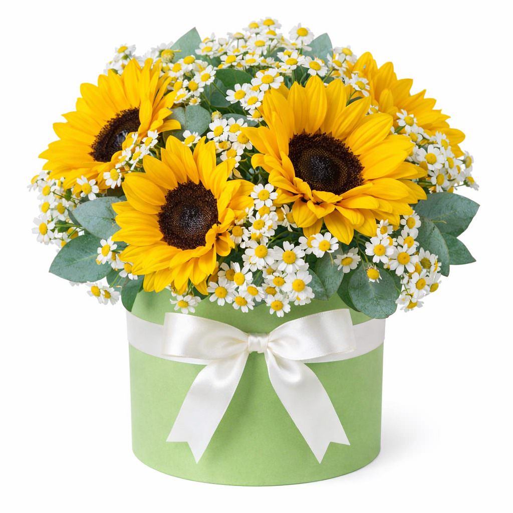 Эта композиция из ярких подсолнухов, нежного танацетума и свежего эвкалипта мгновенно поднимает настроение. Цветы аккуратно уложены в стильную круглую коробку зелёного цвета с элегантной лентой. Букет создаёт атмосферу радости и солнечного тепла. Идеально подойдёт для поздравления подруги на День Святого Валентина.