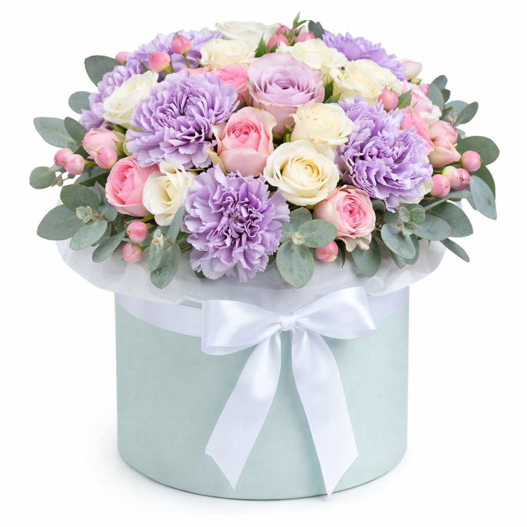 Нежное сочетание сиреневых гвоздик и разноцветных кустовых роз сразу привлекает внимание. В букете также присутствуют гиперикум и эвкалипт, добавляя элегантности композиции. Цветы оформлены в светло-голубую шляпную коробку с белым атласным бантом, придавая изысканности. Этот букет создаст романтическую атмосферу и станет идеальным подарком для крестника на платиновую свадьбу.