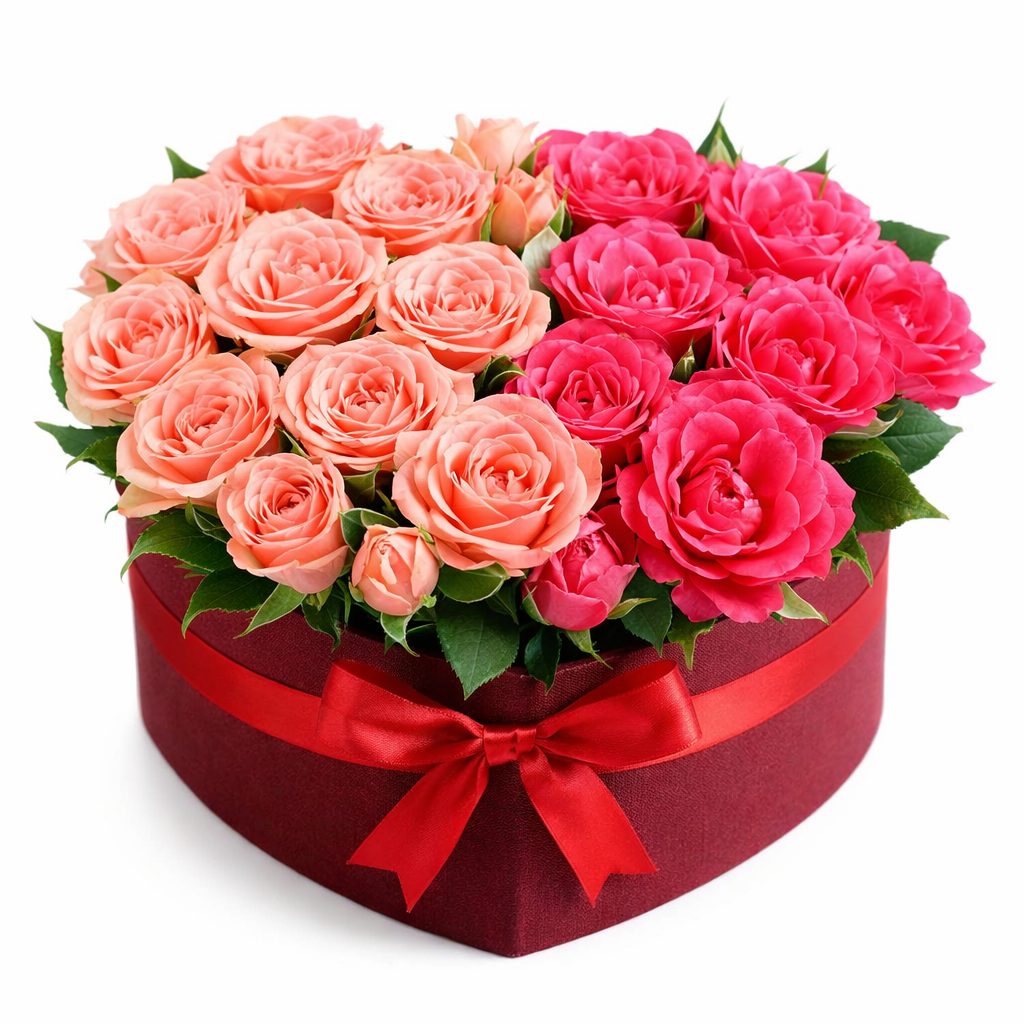 Элегантная композиция в розовых и фуксиевых тонах создаёт атмосферу нежности и романтики. В составе одноголовые розовые розы и кустовые светло-розовые розы. Букет оформлен в коробке в форме сердца насыщенного бордового цвета. Этот подарок станет прекрасным решением для поздравления любимой на День Святого Валентина.