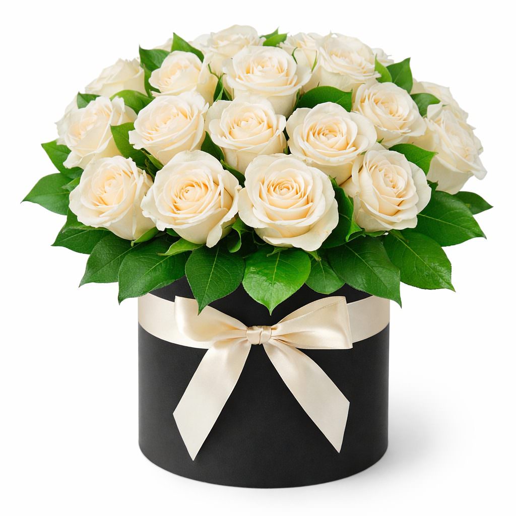 Нежные белоснежные розы в обрамлении свежей зелени создают атмосферу утренней свежести. Эти розы одноголовые гармонично расположены в элегантной шляпной коробке чёрного цвета, которая подчёркивает утончённость композиции. Композиция подарит ощущение гармонии и уюта. Идеально подойдёт для благодарности врачу или для друга на новоселье.