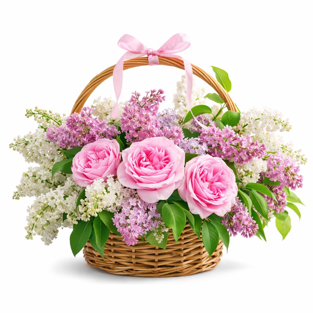 Корзина с розами и сиренью «Нежный рассвет» с гарантией качества, цены и быстрой доставки!