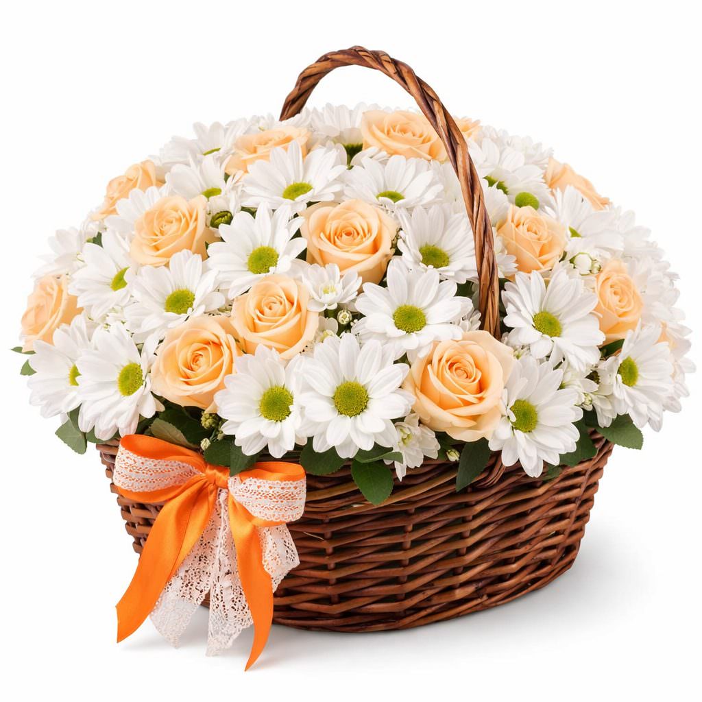 Корзинка с хризантемами и розами «Нежная элегия» с гарантией качества, цены и быстрой доставки!