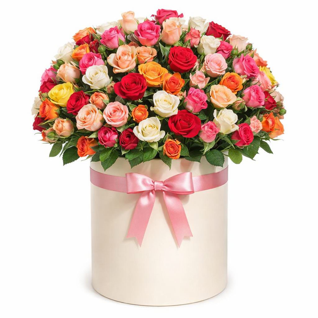 Яркие краски кремовых, оранжевых, красных и розовых кустовых роз создают атмосферу радости. Восхитительное сочетание цветов в шляпной коробке. Коробка кремового цвета гармонично подчёркивает изысканность композиции. Идеально для поздравления с юбилеем, особенно для любимой женщины.