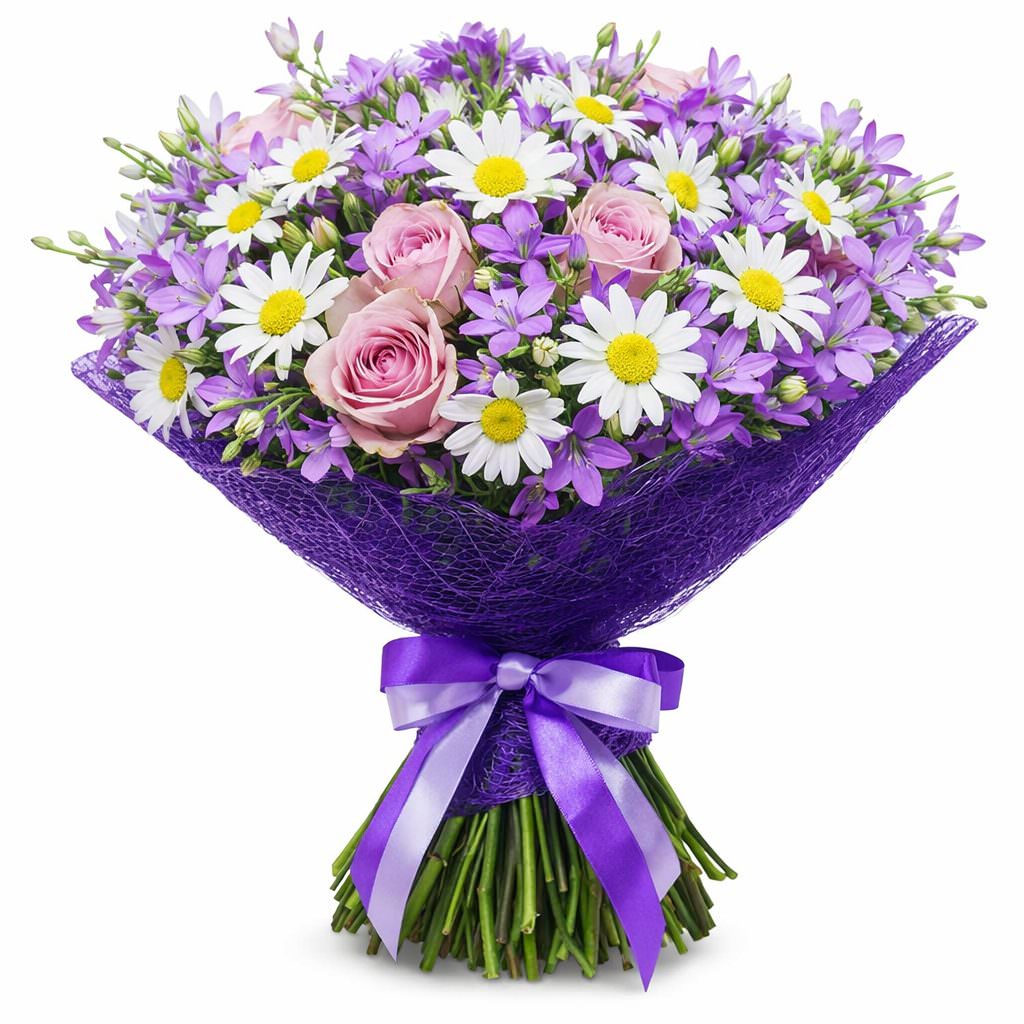 Этот букет окутает атмосферой нежности и спокойствия, благодаря сиреневым и белым оттенкам. В составе букет украшен колокольчиками, сиреневыми розами и ромашками. Упаковка выполнена из фиолетовой декоративной сетки и дополнена яркой атласной лентой. Композиция создаёт романтическое настроение и идеально подходит для подарка любимой женщине на годовщину.