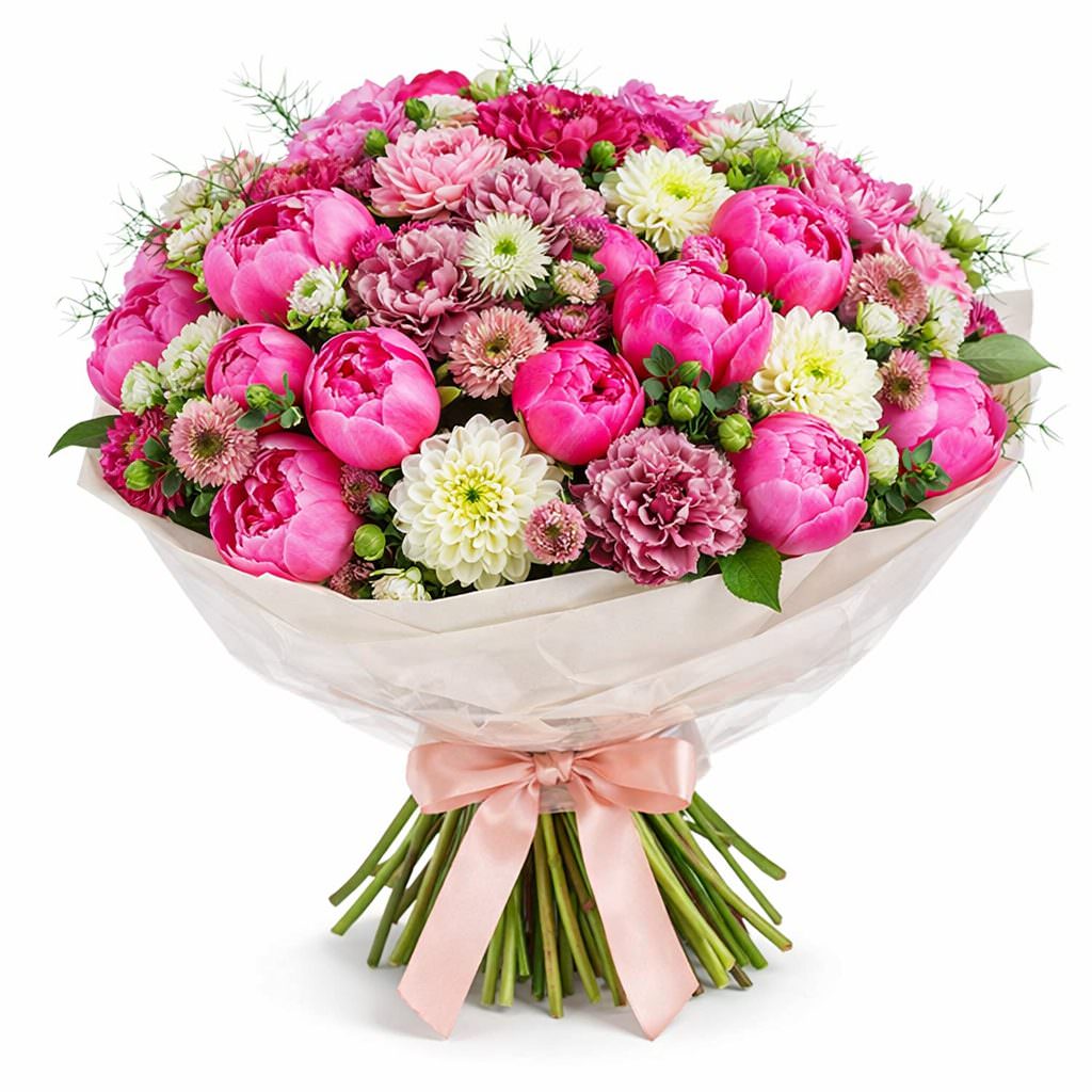 Яркие розовые и сиреневые оттенки вызывают чувство нежности и радости. В букете собраны розовые пионы, розовые гвоздики, сиреневые кустовые хризантемы, белые георгины и зелень. Упаковка выполнена из матовой и прозрачной плёнки и перевязана атласной лентой нежных оттенков. Композиция создаёт атмосферу романтики и утончённости. Подходит для подарка любимой на романтический вечер.