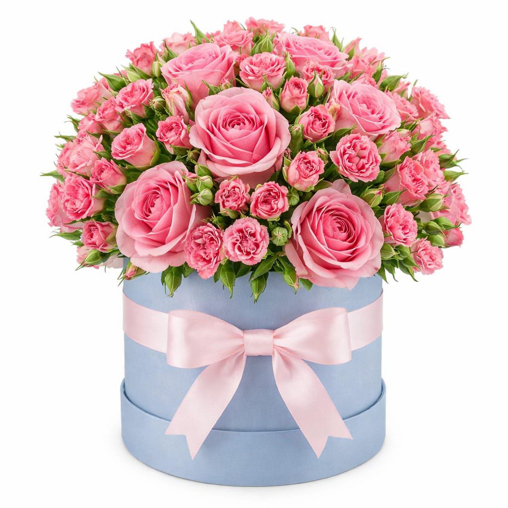 Яркие розовые оттенки роз одноголовых и роз кустовых создают атмосферу нежности и романтики. Композиция из розовых роз в шляпной коробке с голубым оттенком, украшенной широкой атласной лентой, станет изысканным акцентом. Идеально подойдёт для романтического вечера на День влюблённых, чтобы порадовать любимую женщину.