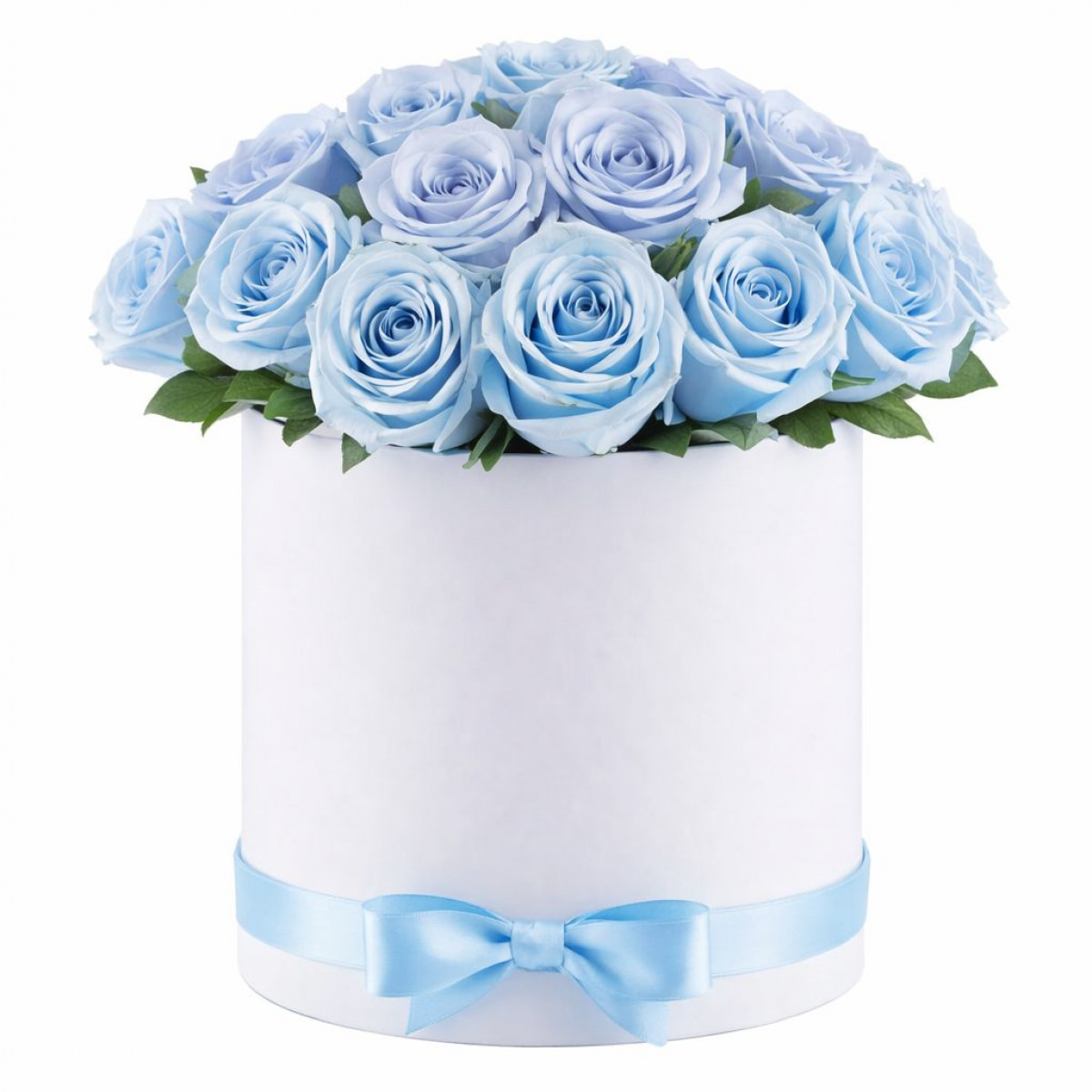 Шляпная коробка с голубыми розами «Небесная нежность» с гарантией качества, цены и быстрой доставки!