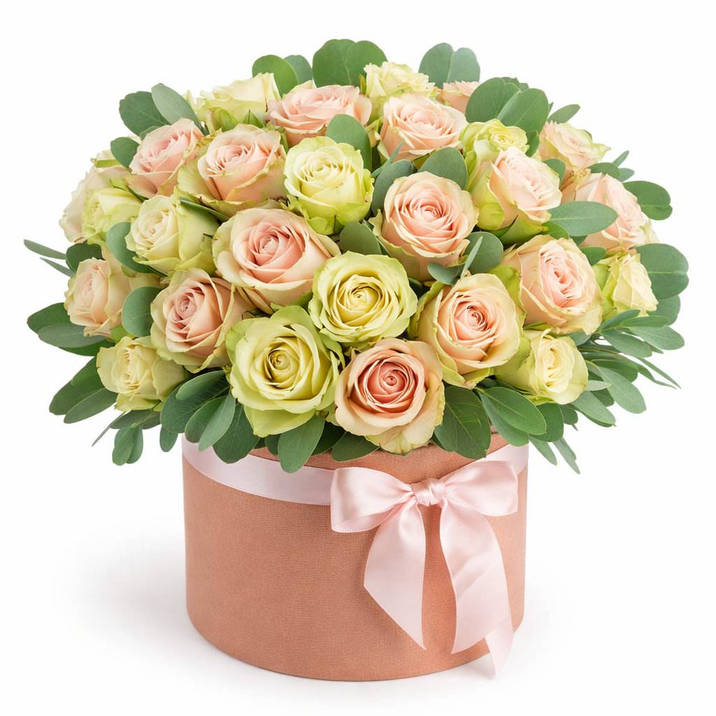Этот букет создает атмосферу нежности благодаря кремовым и желтым оттенкам роз, дополненных зелёным эвкалиптом. В состав входят розы одноголовые микс и эвкалипт. Композиция оформлена в стильной шляпной коробке нежного розового цвета с атласной лентой. Подойдет для декора мероприятия и станет прекрасным подарком для молодой мамы на 9 Мая.