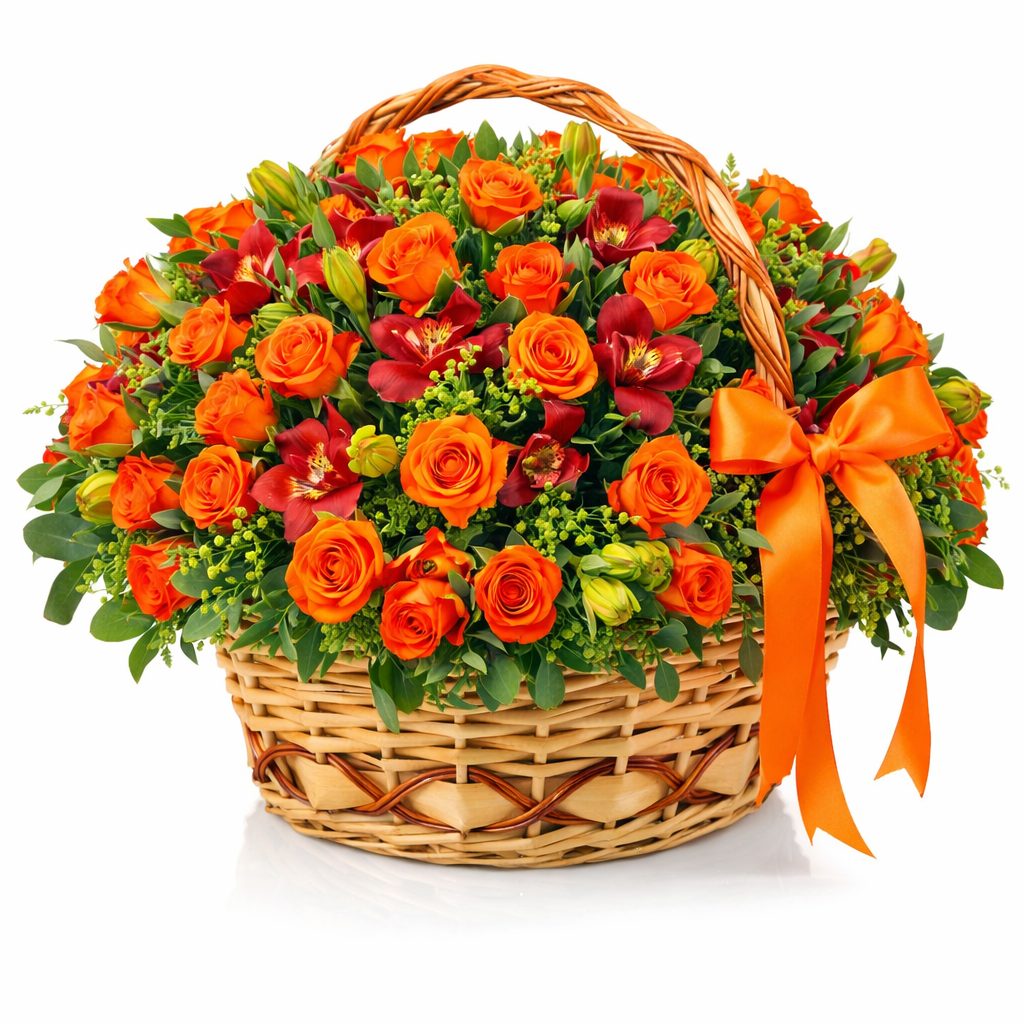 Яркие оранжевые и красные оттенки цветов создают атмосферу радости и тепла. В составе композиции оранжевая кустовая роза, красная альстромерия и красная орхидея, дополненные зеленью. Все цветы расположены в плетёной корзине с удобной ручкой. Эта композиция станет прекрасным подарком на День матери для любимой мамы.