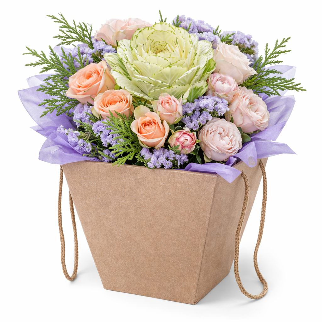 Светлая и нежная палитра композиции покоряет с первого взгляда. В составе декоративная капуста, роза кустовая персиковая, роза пионовидная розовая, белая гвоздика, сиреневая статица и туя. Букет оформлен в картонной коробке с ручками, дополнен нежной фиолетовой бумагой, подчёркивающей его утончённость. Создаёт атмосферу романтики и свежести. Идеально подойдёт для встречи из поездки для любимой женщины.