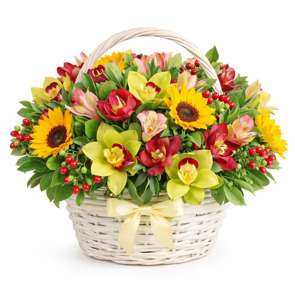 Яркая и солнечная композиция с подсолнухами, желтыми и красными орхидеями, розовыми альстромериями и гиперикумом. Все цветы собраны в белую плетёную корзину, создающую атмосферу уюта и радости. Этот букет станет прекрасным украшением интерьера и подойдёт для вручения на День Святого Валентина. Идеальный подарок для любимой женщины, который обязательно подарит ей искреннюю улыбку.